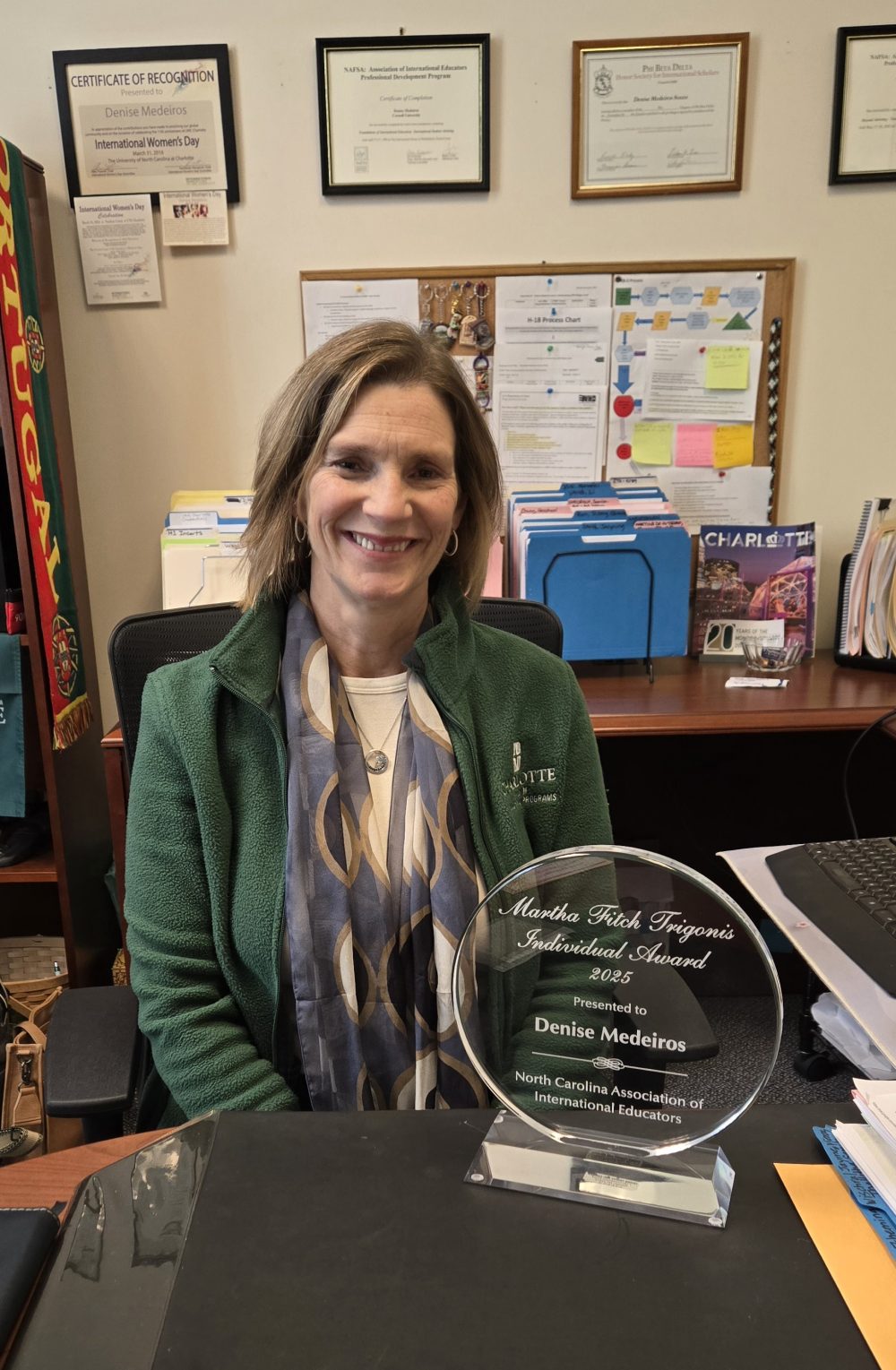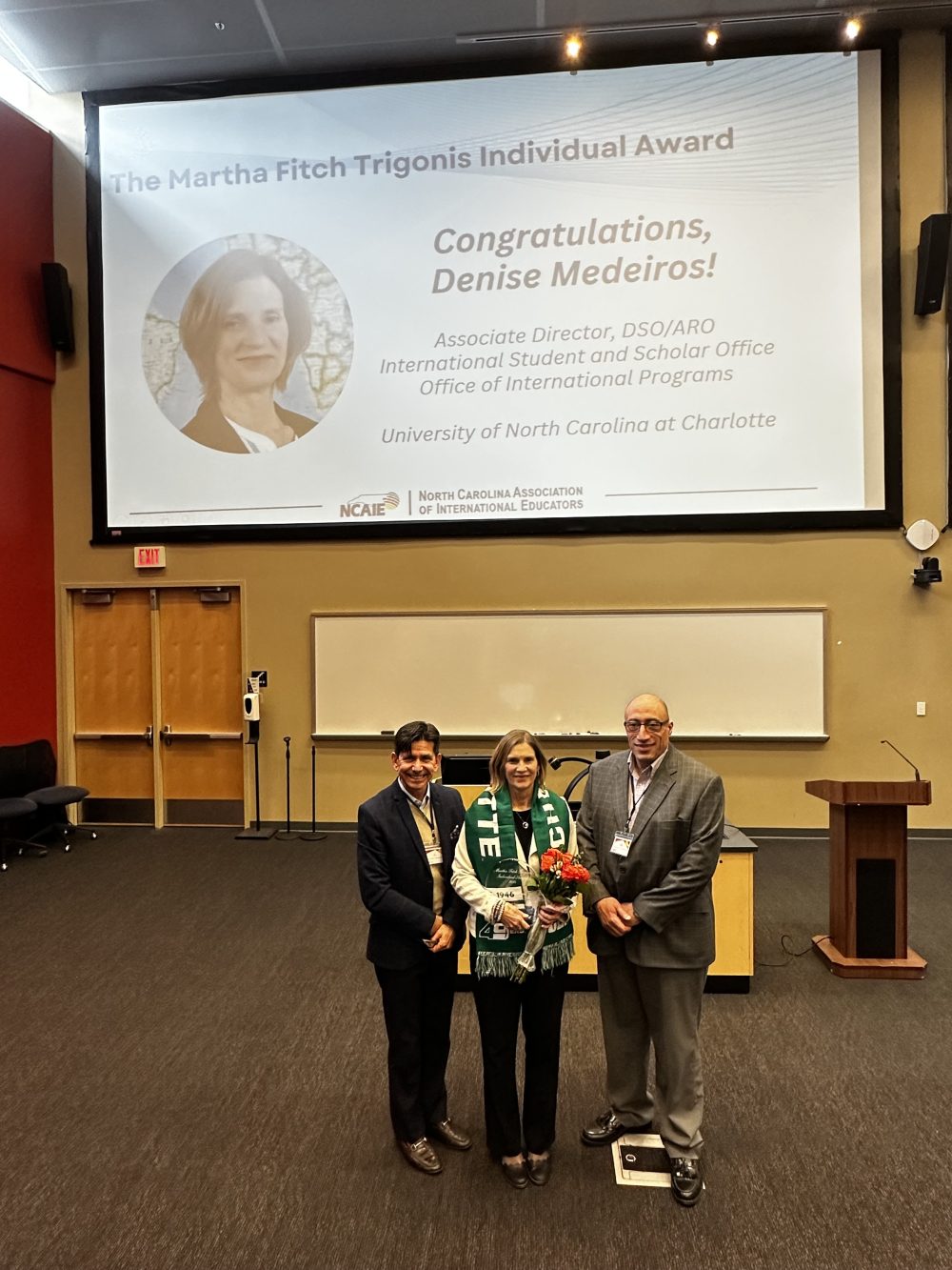 On March 7, Denise Medeiros received the 2025 North Carolina Association of International Educators (NCAIE) Martha Fitch Trigonis Award, recognizing her 30-year commitment to international education. This award honors individuals for their exceptional dedication and impactful contributions to international education at the state, regional, and national levels.