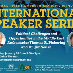 Event Date:January 18, 2018 – 3:30 PM to January 19, 2018 – 4:59 PM Location:Atkins Library, Halton Reading Room ** Please note*** The International Speaker Series lecture featuring Ambassador Ryan Crocker has been canceled due to the worsening weather conditions on the UNC Charlotte campus. Please note that a decision about UNC Charlotte classes and […]