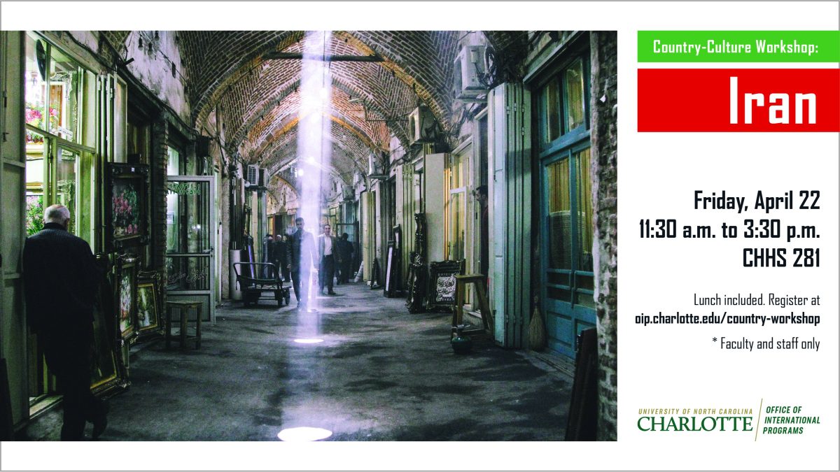 In collaboration with UNC Charlotte colleagues, the Office of International Programs invites interested faculty, staff, and administrators to register for the upcoming Country-Culture Workshop featuring Iran. A traditional Iranian lunch is included. There are a limited number of seats available, so please register as soon as possible to reserve your spot.